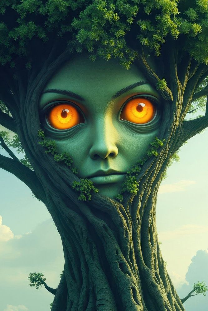 A digitally created image depicts a large tree with a woman's face forming its trunk. The tree has lush green leaves, visible roots, and is situated in a field of orange flowers against a cloudy sky. The woman's face has bright orange eyes.