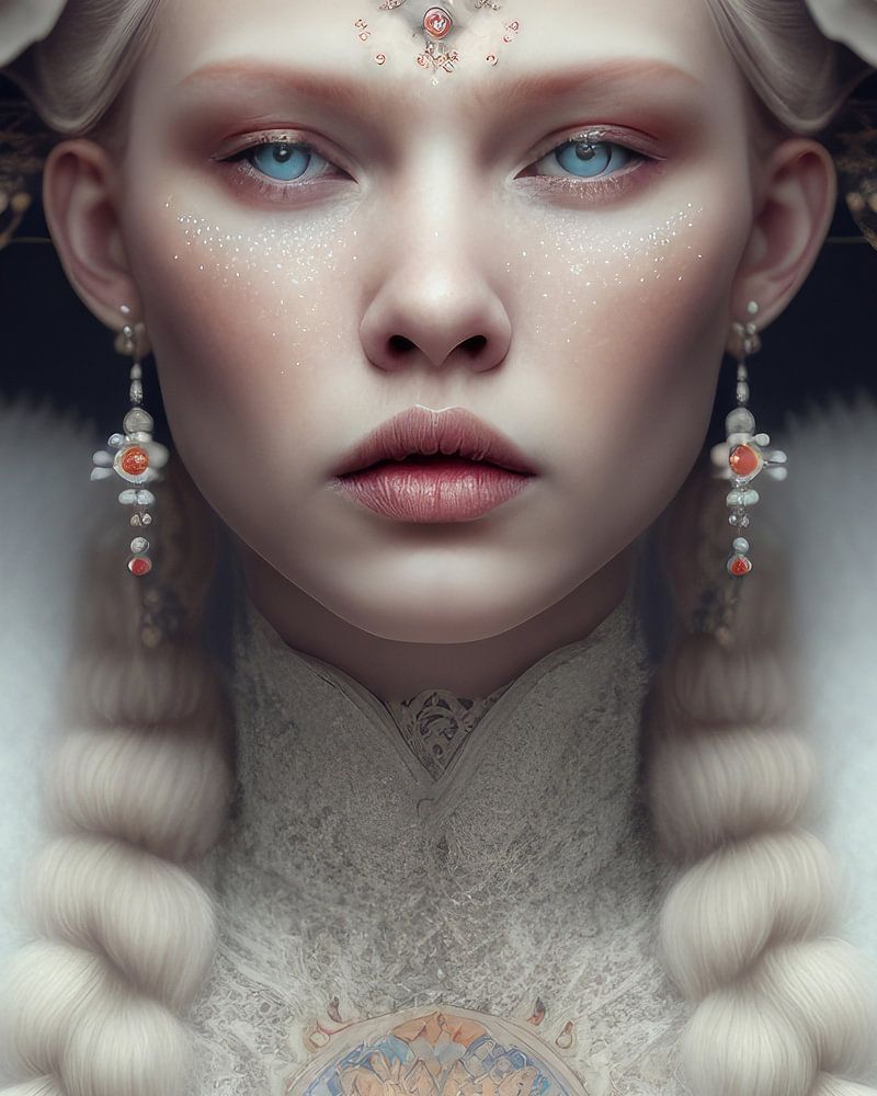 Digital art: "Queen of whites". Portrait of a young woman in white, long braids and soft taupe colours. On her hair a crown and softly coloured flowers. She wears a fur collar, earrings and beautifully detailed costume. A queen as you would expect in a fantasy fairytale.