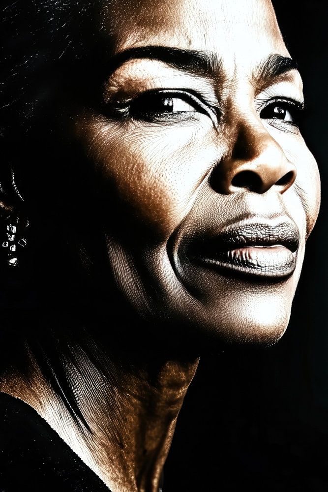 This striking portrait shows an elegant older black woman in dark clothing and stylish jewellery, sitting in soft light against a dark background. The subtle incidence of light emphasises her facial features in a delicate but powerful way and highlights the depth of her radiance.