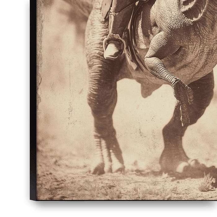 In a buzzing mixture of Wild West charm and prehistoric fascination, a cowboy rides a huge T-Rex through a dusty landscape. The warlike look of the dinosaur combined with the casual appearance of the rider creates an unexpected but captivating image of adventure and daring. Adventurous tropes meet the wilderness of history!