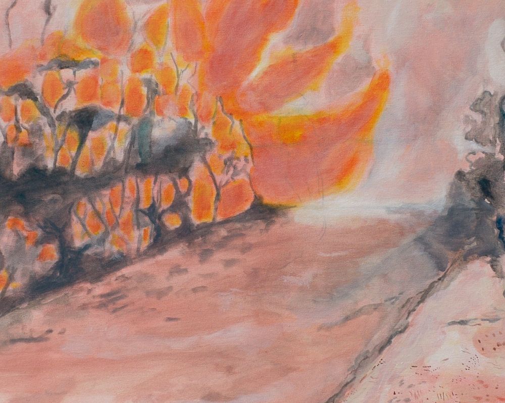 The painting shows a road in the forest that is blazing pink from a fire raging and swallowing the trees. The overall tone of the painting is a warm pink, with gray trees and yellowish fire. It is rich in details, of ground, tree branches, and smoke.