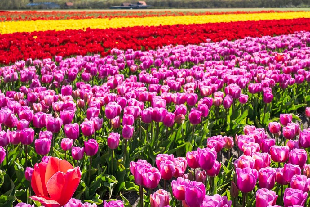 Immerse yourself in the colourful splendour of the Dutch bulb fields this spring! Spring is the season to get outside and enjoy the breathtaking sea of flowers the Netherlands has to offer. Our photo captures a stunning moment from this beautiful time of year, with a field full of tulips in a spectacular array of colours.