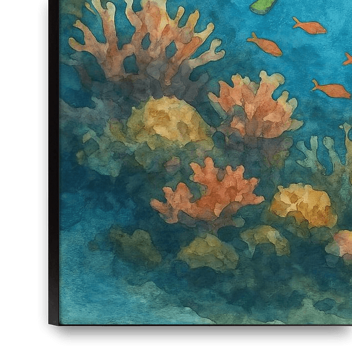 This watercolour painting takes you into the magical silence of the underwater world. Two divers float weightlessly among schools of fish, while a majestic sea turtle slowly makes its way along colourful coral. Small details, such as the bubbles rising from the divers' breathers and the bright orange reef fish playfully swimming through…