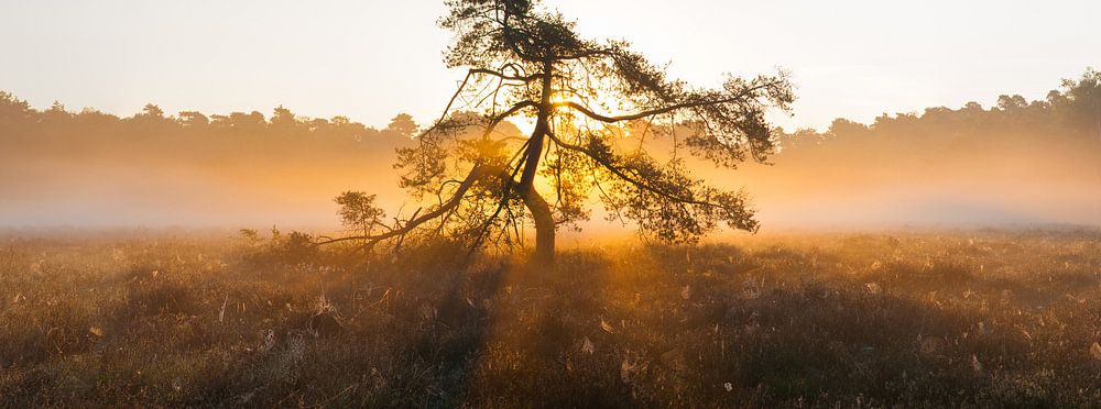Twente on an early Sunday morning. The sun shines just above the treetops while a layer of mist hangs over the ground. Together, this creates a fantastic light effect. The light rays cast a long shadow on the tree standing lonely on the heath. Once the ground is covered by the warmth of the sun, the mist will disappear.