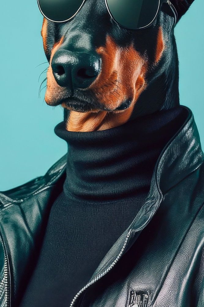 With cool sunglasses and a casual leather jacket look, the Doberman radiates an unmistakable aura of self-confidence and style. Its striking, upright ears and sharp gaze embody both alertness and charisma. A fascinating interplay of elegance and strength that blurs the boundaries between man and beast.