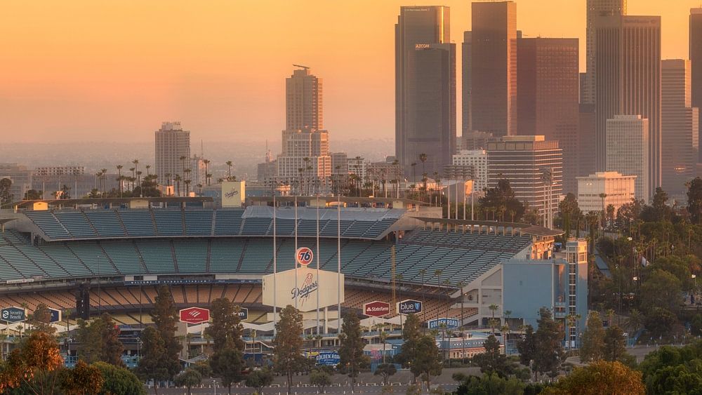 Panoramic shot of Los Angeles Dodgers Stadium and the DTLA skyline on a beautiful summer evening just before sunset.