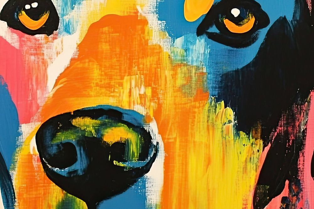 Dog Abstract - This dog painting shows a colourful dog with a cheerful look, painted in bright colours such as yellow, blue and pink, giving it a modern and playful look.