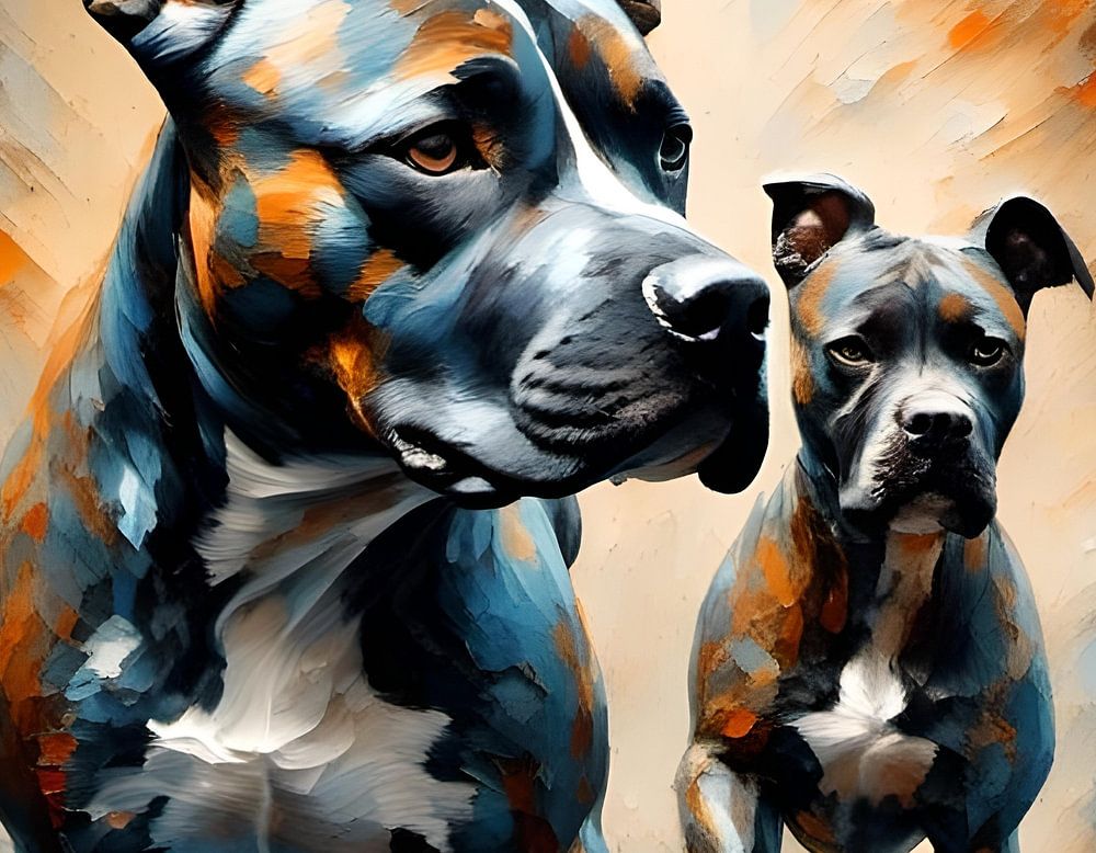 Two dogs are depicted with a vibrant mix of blue and orange swirling around them, creating a dynamic and spirited feel. The larger dog gazes forward with a strong presence while the smaller one looks on slightly behind, both portrayed with a sense of intensity and liveliness.