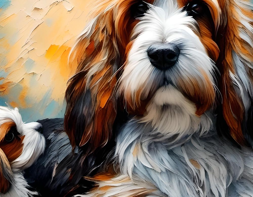 A vibrant portrait depicts a fluffy dog with distinct black, white, and tan fur, accompanied by a smaller dog of similar colors. They are set against a lively backdrop with orange leaves that contrast with the deep blue tones.