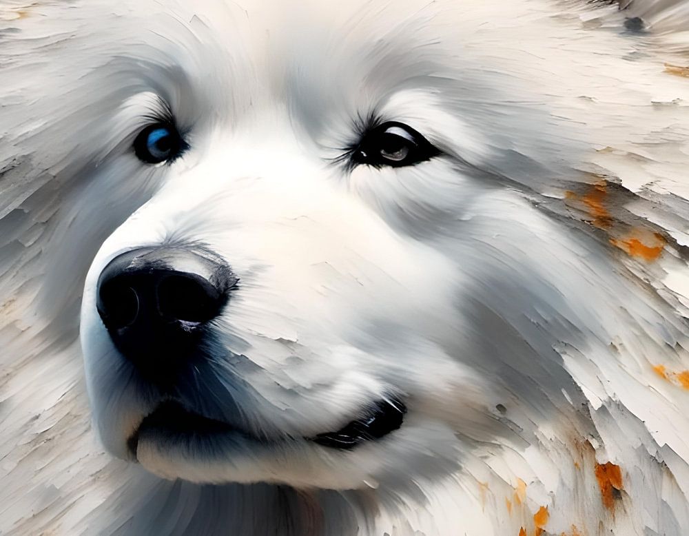A serene white dog with fluffy fur is depicted with a vibrant array of blue and orange abstract strokes surrounding it. The dog's expression is calm and attentive, and the artwork has a dynamic yet harmonious feel, blending realism with expressive color splashes.