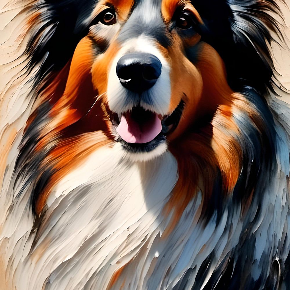 A vibrant portrait depicts a Shetland Sheepdog, often called a Sheltie, with a striking blend of colors highlighting its long fur. The dog is set against a background with splashes of orange and blue, giving the impression of a lively, dynamic environment.