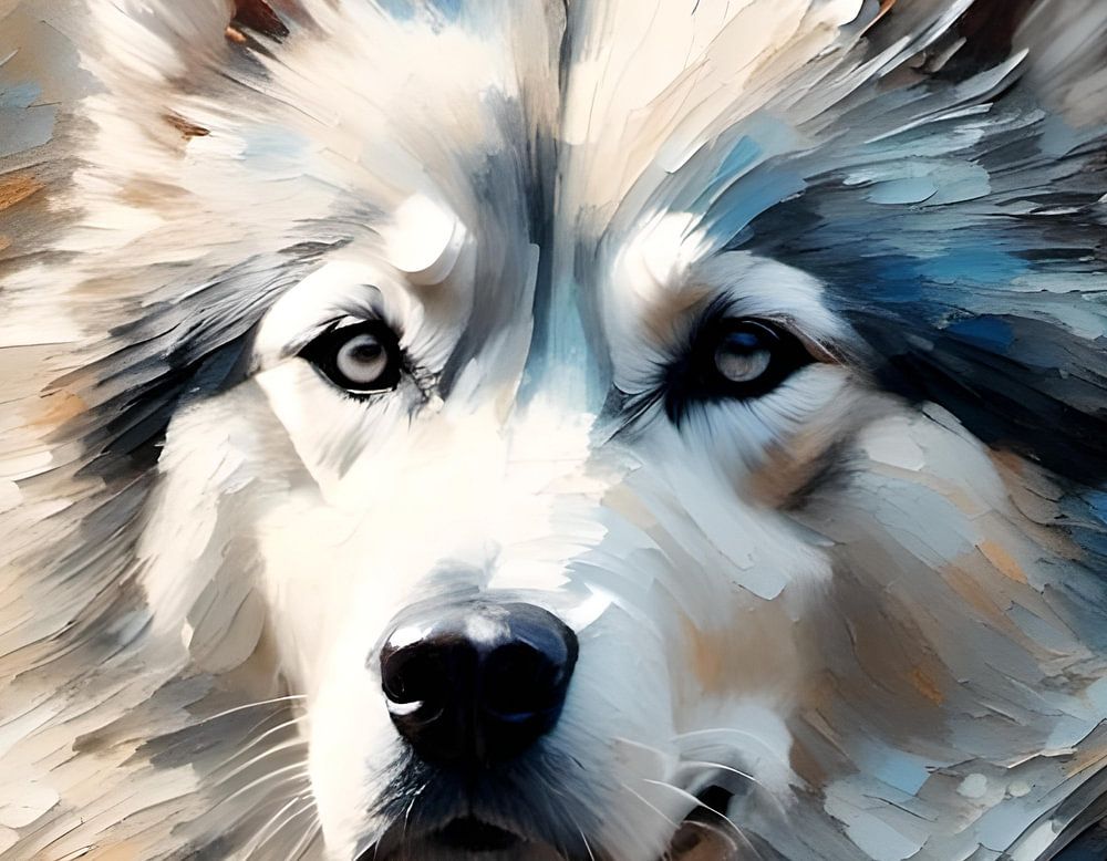 A vivid portrait focuses on the intense gaze of a Husky with striking blue eyes set against a background of bold brushstrokes in blue, orange, and white tones. The artist has captured the thick fur and alert expression typical of the breed, lending the piece a sense of life and energy.