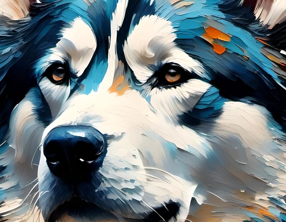 A vibrantly colored digitally stylized portrait of a Husky dog is presented, with bold brush strokes and a burst of orange and blue hues. The Husky's piercing blue eyes and thick fur are depicted with great detail, capturing the essence of the breed's striking appearance.