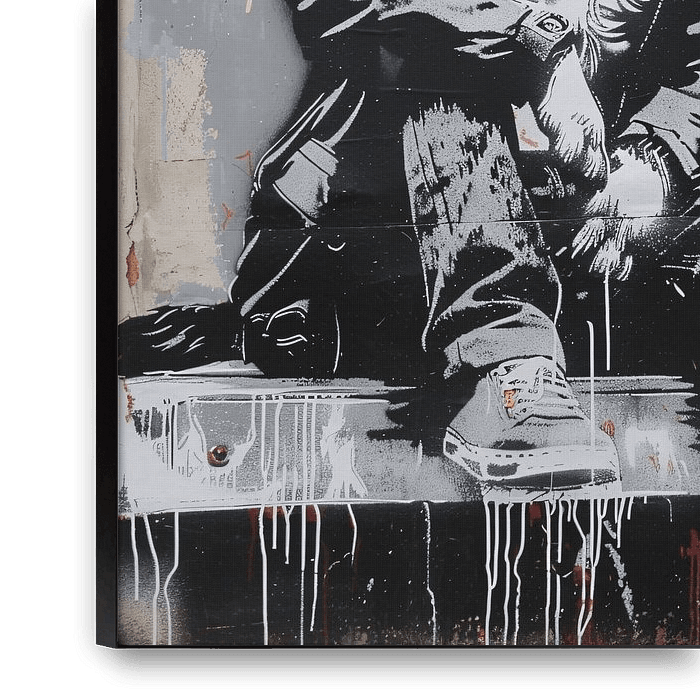 This striking artwork depicts a dog with a human touch. Clad in a red hat and a casual outfit, he sits absorbed in thought on a concrete ledge. The black and white image with red accents exudes an urban vibe, perfect for a modern, industrial interior. The work raises questions of identity and perspective, making it a real eye-catcher…