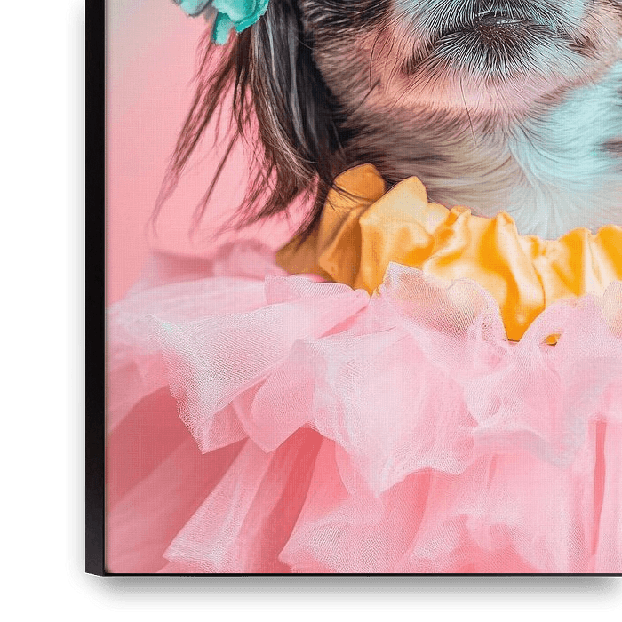 An adorable Chihuahua in a colourful tutu and with a blooming wreath of flowers adds a touch of joie de vivre to any room. With its sweet, mischievous look and playful colour palette, this work of art brings joy and colour to the living room. Perfect for animal lovers and anyone who appreciates something special!