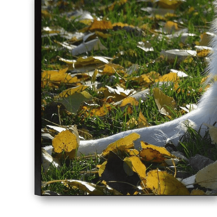 This is a picture of my dog lying in the grass between the leaves. It is a border collie crossed with an Australian stepherd. You see a beautiful sunshine.