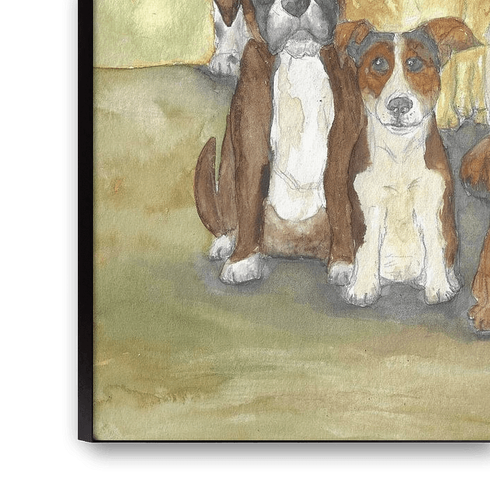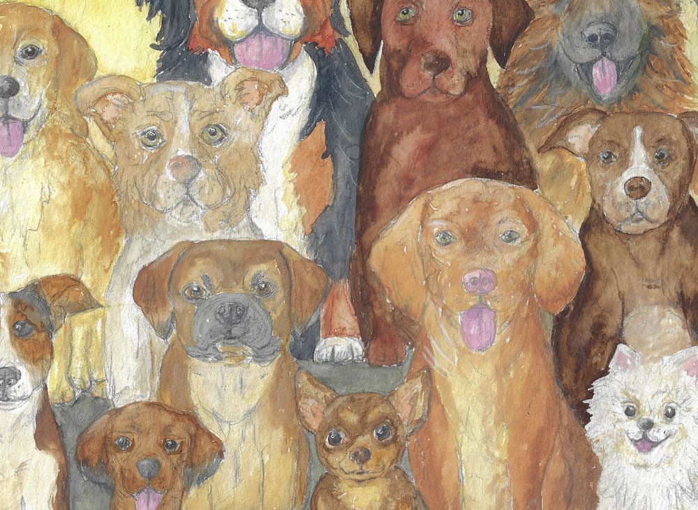 This cute watercolour shows sixteen different dog breeds looking attentively at the camera, just like in a photo.