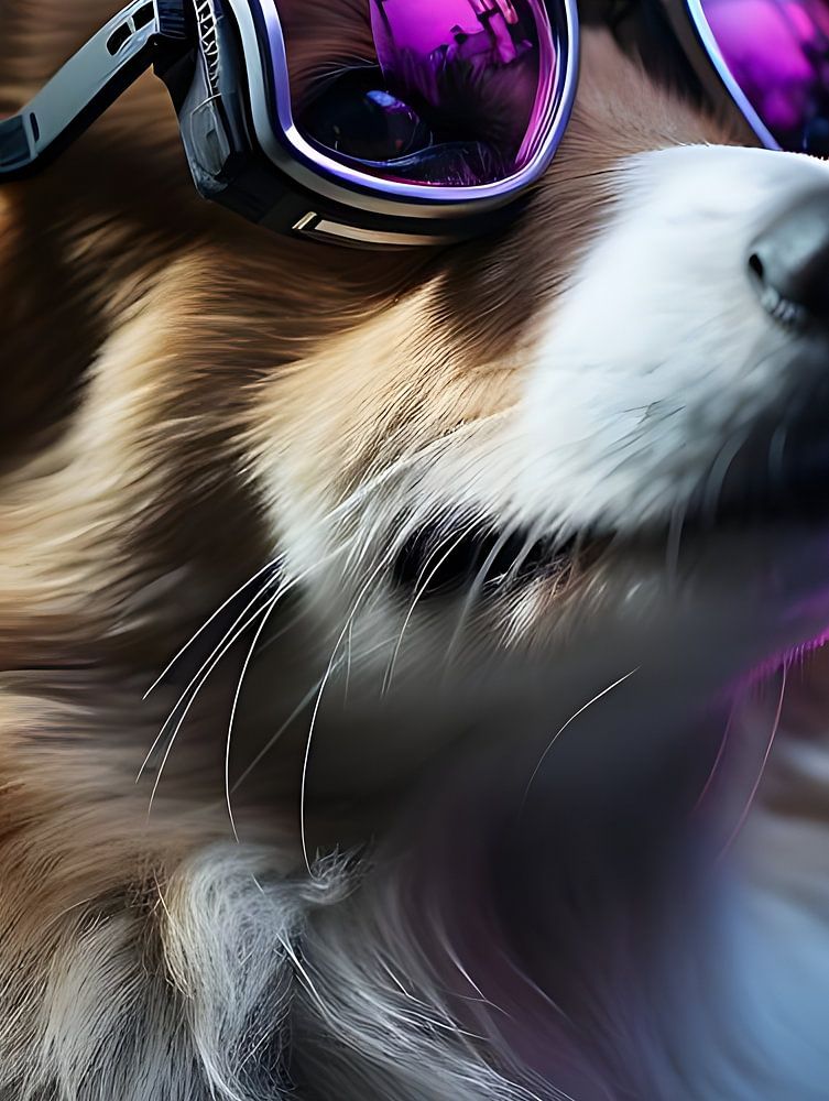 A cute dog with glittering eyes and purple glasses steals hearts with his unique style. His wagging tail and playful attitude spread joy around him. The purple glasses add a touch of mischief to his charming appearance, giving him an irresistible and quirky personality that enchants everyone.