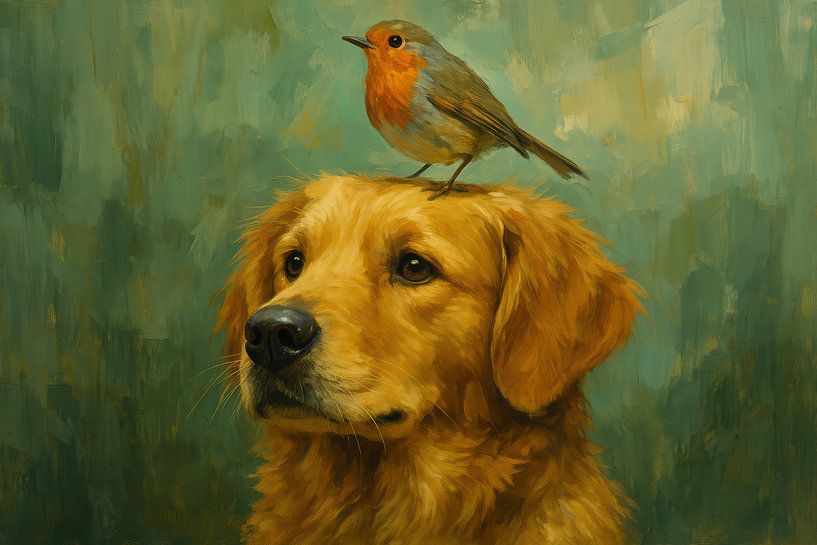 A golden retriever gazes calmly ahead, while a robin balances lightly on its head. Soft brushstrokes make the coat shine and give the red of the breast a lively accent. In the background, green, blurred areas float, creating depth and serenity. The subtle light from the left sets the muzzle and feathers in a warm-cold contrast. The…