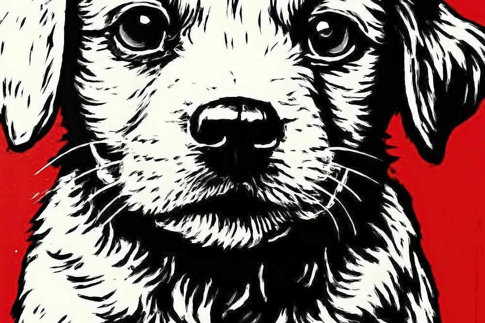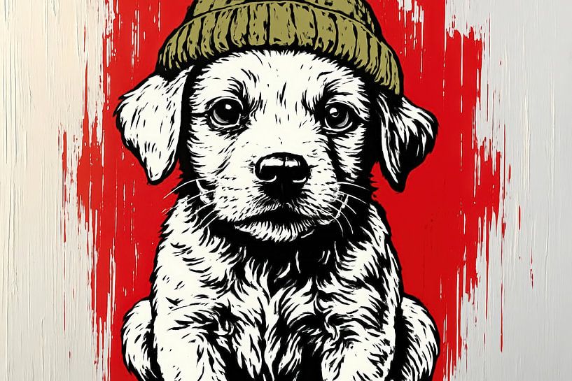 A seated puppy in black and white linework looks straight ahead, while a chunky red paint patch with ragged edges pops behind him. The ribbed knitted hat adds a playful urban twist. Tight contours and subtle shading add depth, prompted by the strong contrast between white fur and dark lines. The grey background tempers the scene and…