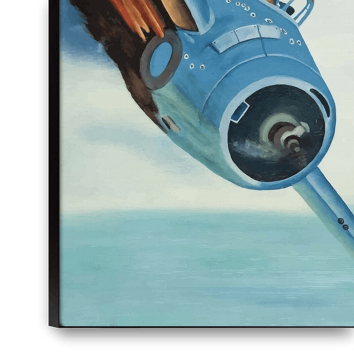 A dramatic and intense oil painting depicting a World War II dogfight over the Pacific Ocean. A damaged US fighter plane is shown in a nosedive, with the pilot bailing out, as a Japanese fighter plane attacks from above.