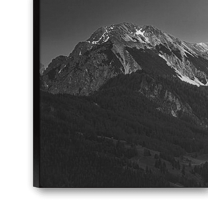 A wide 65:24 Xpan panoramic image in Black and White of the snow-capped Dolomite mountains, located in the Italian province of South Tyrol in northern Italy.