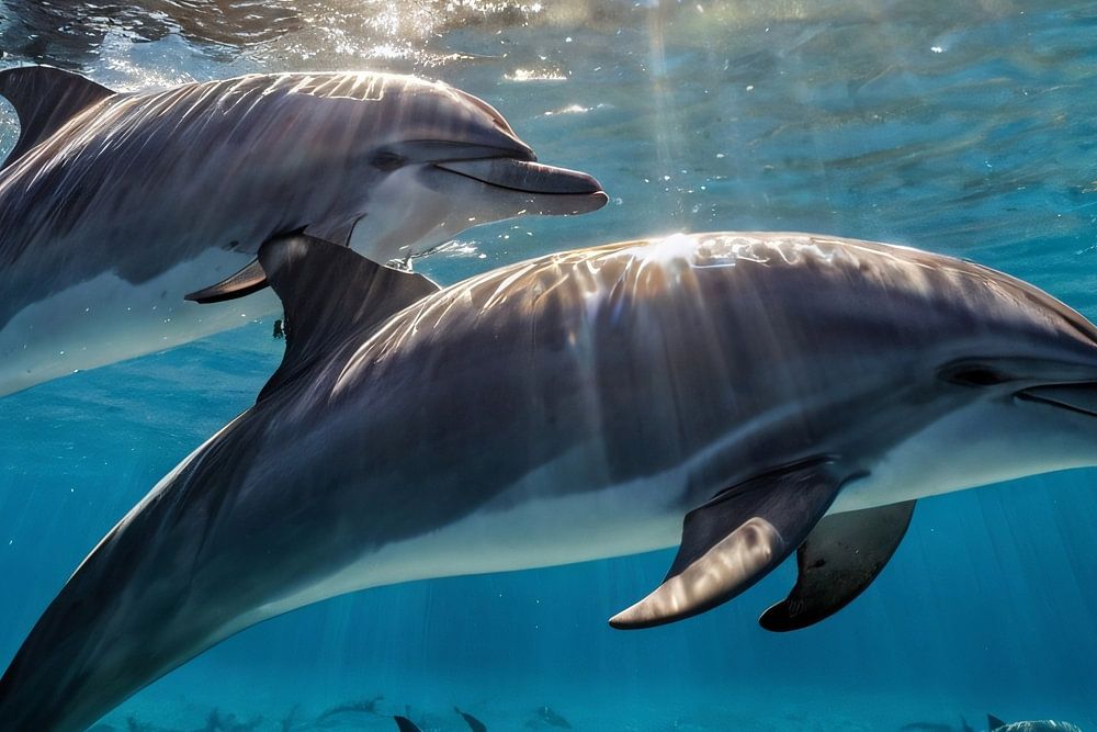 This stunning underwater design shows a group of playful dolphins swimming through crystal clear water, illuminated by the warm rays of the sun. The enchanting colours of blue and turquoise create a serene and dynamic atmosphere that is perfect for any modern interior style. This artwork not only captures the beauty of nature, but also radiates energy and tranquillity. Perfect for bringing a sense of calm and connection with the ocean into your space. Ideal for living rooms, offices or dining rooms.