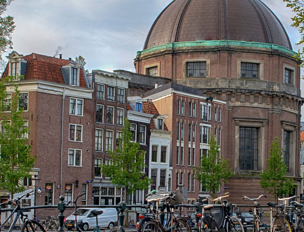 The Koepelkerk (Dome Church) characterizes the sculpture on this part of the Singel in Amsterdam.