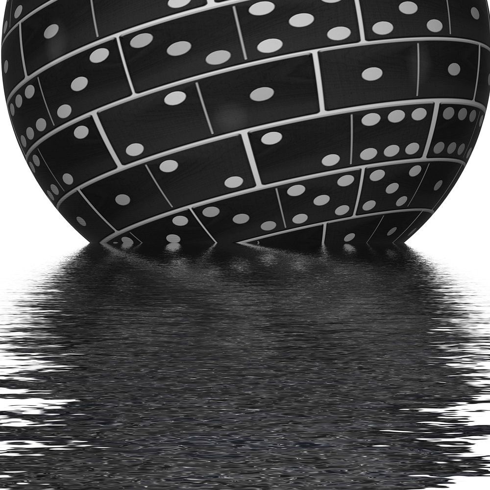 Digital composite black wooden domino tiles in a sphere reflected in water effect dominoes, dominoes, game, tile, stone, piece, games, sphere, planet, globe, dawn, morning,