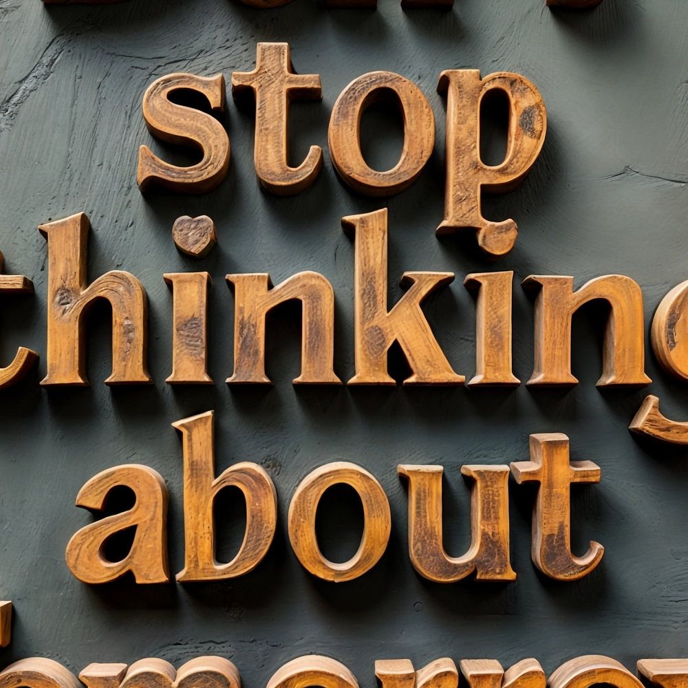 A weathered text with the words *Don't Stop Thinking about Tomorrow* in ornate, old letters hangs against a rough concrete wall. The paint has flaked off here and there, and the background has a weathered, vintage look. The wall shows cracks and stains, giving it a robust, industrial feel.