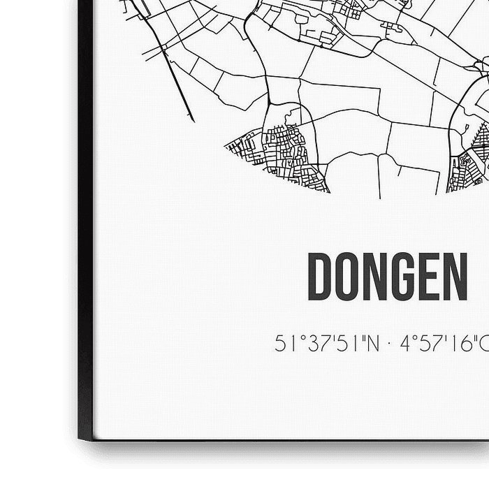 Black and white map, street map or street plan of Dongen. Dongen is located in the municipality of Dongen, province of North Brabant. The city map includes all public roads in Dongen. Furthermore, the map features the coordinates of the center of Dongen.
