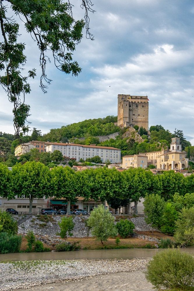 The medieval keep of Crest is the oldest in France. It is 52 meters high and stands on a hill at the back of the village. The overcast sky makes the yellowish tower stand out well. The river Drome can be seen in the foreground.