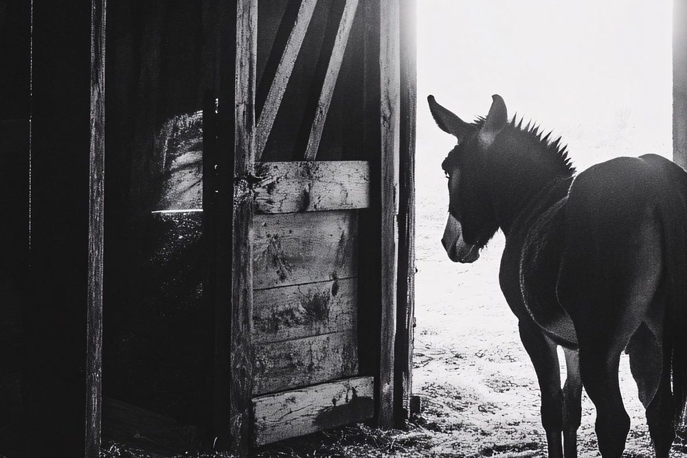 This impressive photograph shows a lone donkey standing in the shadow of an old, wooden stable. The soft light falling in through the door outlines the contours of the animal, creating an atmospheric, rustic look. The picture evokes a sense of stillness and simplicity, perfectly suited to a rural atmosphere. Ideal for lovers of country style and animal photography, this design exudes a serene beauty and adds character to any room. It is a wonderful choice for a bedroom or utility room, where it brings a sense of tranquillity and nostalgia.