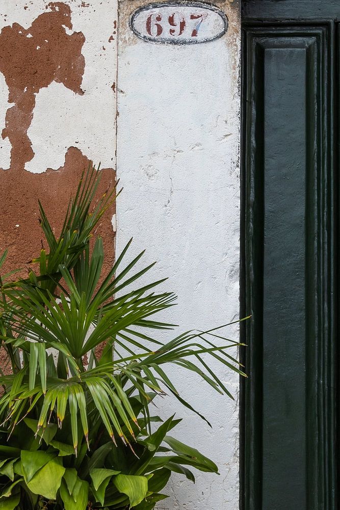 The planter with the palm is the main subject in this image and stands out, due to its fresh green colour. The image is complemented by part of the door and a weathered wall!!!