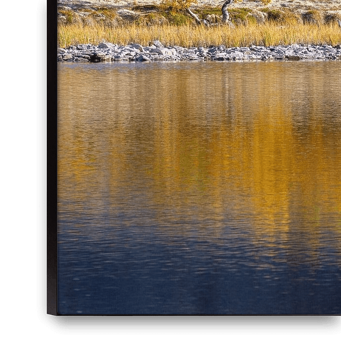Coloured birch trees reflected in the lake, Doraldalen, Rondane National Park, Oppland, Norway