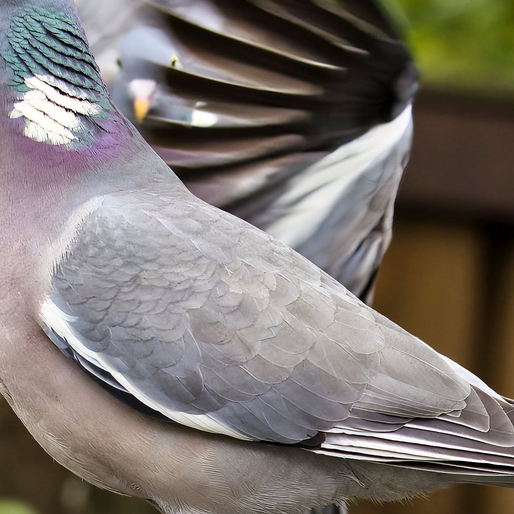 Two wood pigeons make pretty ornaments. In the garden, these two regularly come to see if breakfast, lunch or dinner is served. In the imagination, it looks as if the rear pigeon is dancing the Flamenco for his sweetheart.