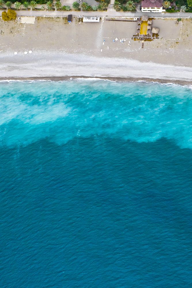 Down the winding road, hotels, autumn cypress - Aerial view from top to bottom of the turquoise sea  by Michael Semenov