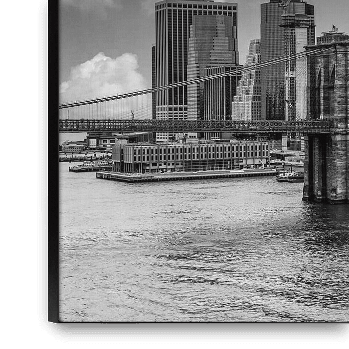 Downtown Manhattan with the Brooklyn bridge on a sunny day in New York black and white