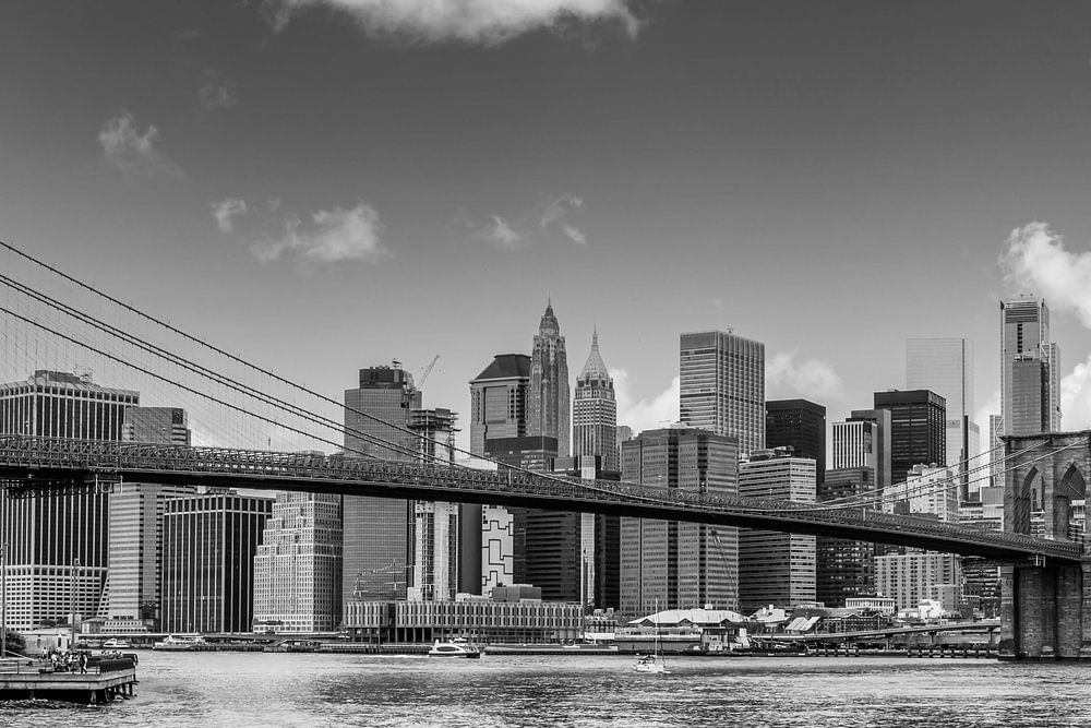 Downtown Manhattan with the Brooklyn bridge on a sunny day in New York black and white