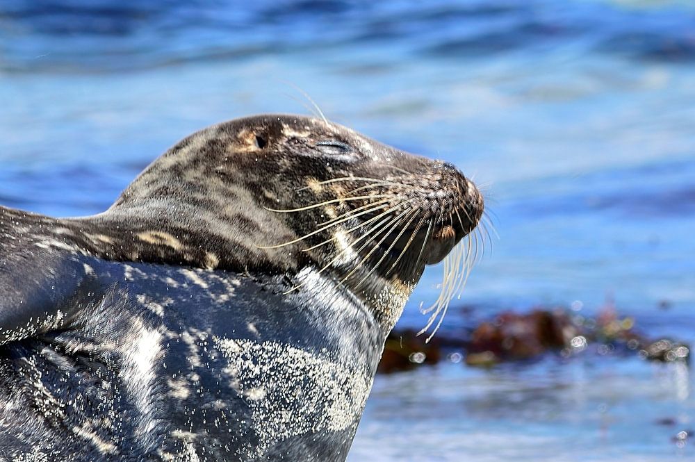 A beautiful fur seal dozing off while basking in the sun on the beach at Seal Rock in the La Jolla area of the city of San Diego in California, USA. It really seems to be totally relaxed.