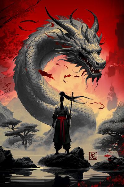 A lone warrior stands defiant before a colossal, soaring dragon. The fiery red sky heightens the epic scale of this encounter. It is a powerful depiction of courage, destiny, and the legendary struggle between man and the divine beast.