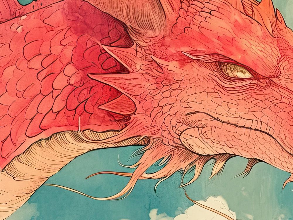 Details: dragon, cloud, fiery, mythical, fantasy, eye, scales, teeth, sky, red