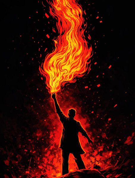 Intense illustration of a man courageously holding a massive, roaring fire torch high in the darkness, with vibrant flames and sparks creating a powerful sense of defiance, passion, and leadership in a striking, high-contrast style.