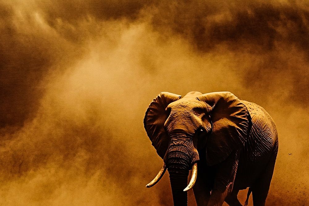 This beautiful image shows an impressive elephant in a dramatic dusty landscape. The warm tones and dynamic contrast give a unique look to any interior. Perfect for lovers of nature and animals. Add a touch of strength and elegance to your space with this extraordinary design.