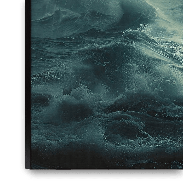 A hyper-realistic image of a lighthouse surrounded by roaring waves, storms and dark clouds.