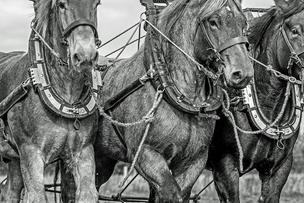 Buy the photo Draught horses, black and white by Lisette van Peenen on canvas, ArtFrame, poster and wallpaper, printed on demand in high quality.