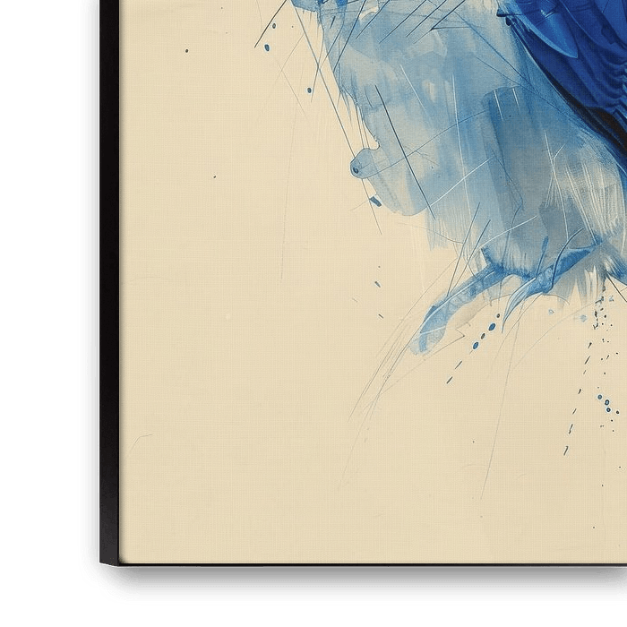 Keywords: Chinese ink, bird, blue, abstract, contemporary, dynamic, expressive, minimalist, stylised realism, watercolour. colours: blue and black for the bird, with a neutral beige background.
