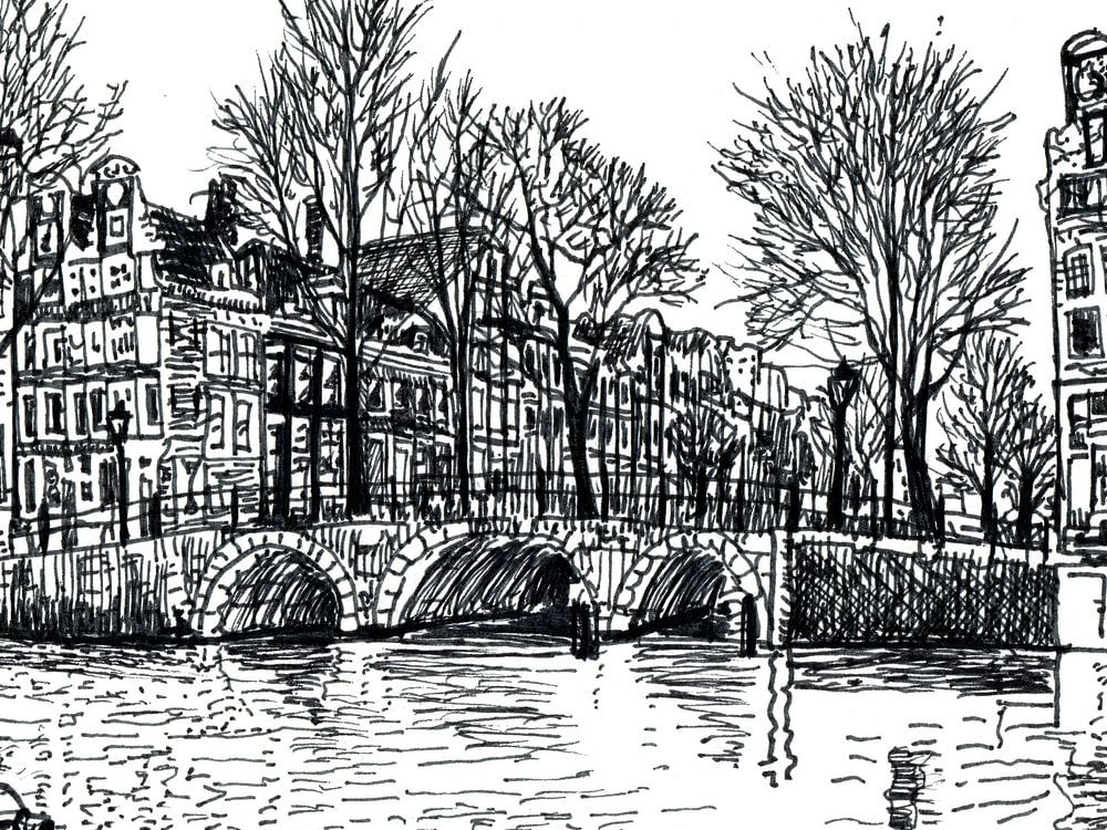 Drawing of the Keyzersgracht in the heart of Amsterdam. Bridges, canals and canal houses from centuries ago decorate the view. Typical Amsterdam.