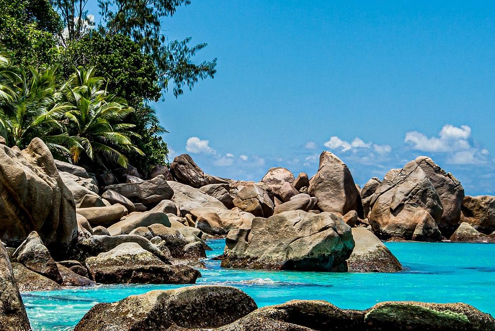A small bay in the island paradise of the Seychelles, in the middle of the Indian Ocean. Blue sky, crystal clear turquoise water, yellow beach with fine sand, rocks, stones and lush green tropical vegetation in the background. This is the dream beach Anse Georgette on the island Praslin.