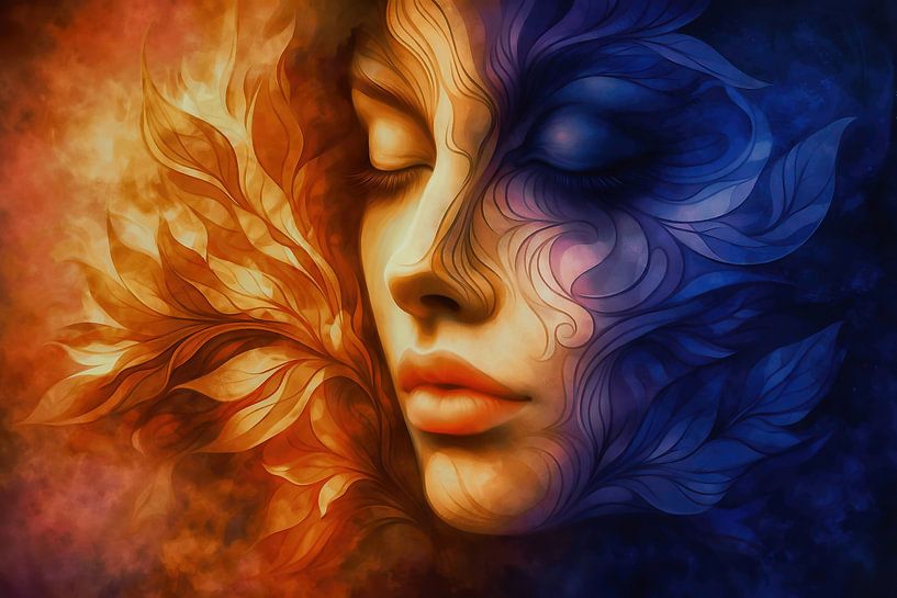 This painting shows a stylised portrait of a woman divided into two contrasting halves expressing duality and balance. The left side is bathed in warm, fiery hues of orange, yellow and red, evoking a sense of passion or energy. The right side is enveloped in cool, calm shades of blue and purple, suggesting serenity or mystery. The…